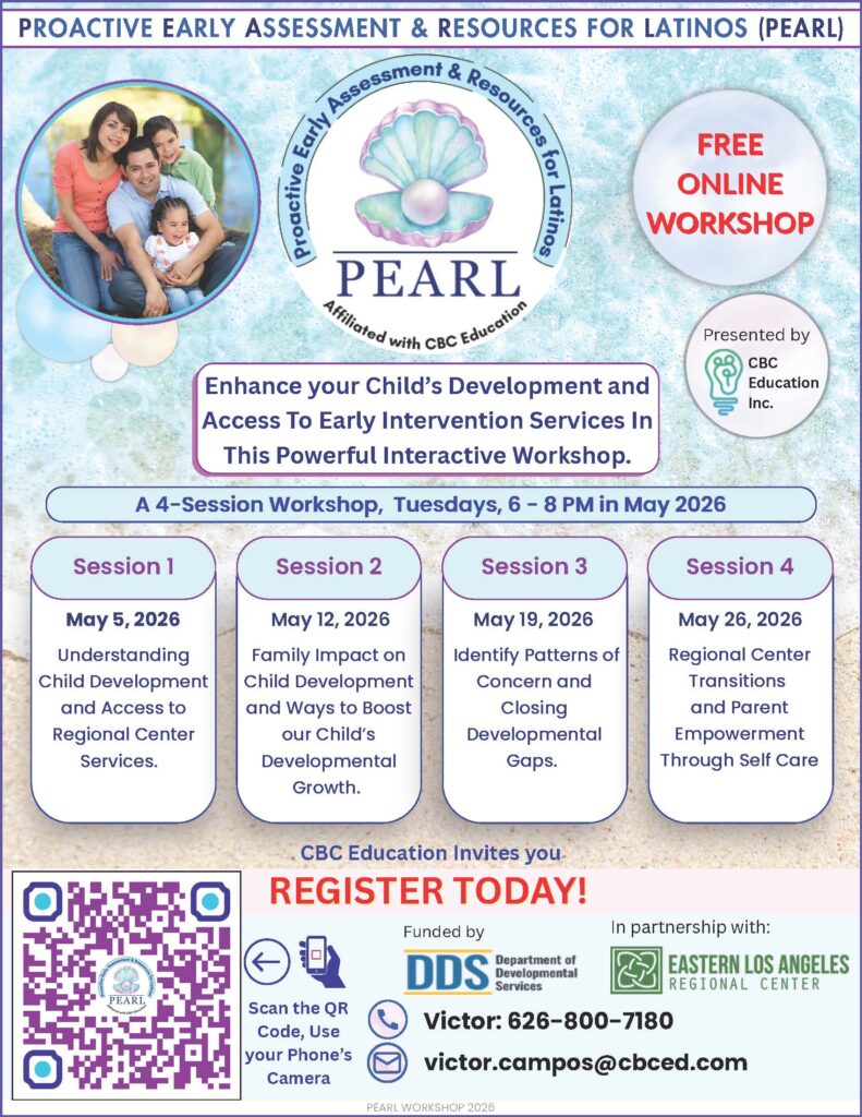 CBC Education is excited to announce the return of their acclaimed workshop, PEARL (Proactive Early Assessment and Resources for Latinos), which will be conveniently presented via Zoom. This workshop is free and accessible to all Regional Center families, thanks to funding from the Department of Developmental Services (DDS).